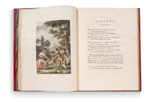 CLARIS de FLORIAN. Galatée, roman pastoral ; imité de Cervantes. À Paris, Chez Defer de Maisonneuve, 1793. In-folio (33,6 x 25 cm), 125 pp., 4 figures gravées en couleurs. Maroquin rouge du XIXe, dos à 5 nerfs, auteur et titre doré, caissons...