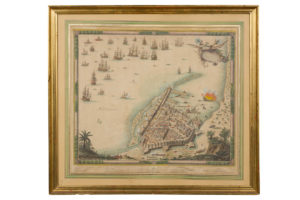 rue St André des Arts, Porte de Buçy”, (ca 1685). In-folio carré (62 x 69,5 cm). Sous cadre de bois doré moderne et marie-louise soulignée d'un ruban doré. Grande carte navale gravée en noir à l'eau-forte et au burin, finement mise en couleurs à l'époque. Avec la Table de l'Armée Navale du Roy énumérant les noms des vaisseaux de la flotte. Cartouche de titre aux trompettes de la Renommée, dans le goût de l'époque. Seuls 3 exemplaires (non coloriés) dans les collections publiques dont le Louvre. Illustre le bombardement de Tripoli-base des barbaresques au XVIIe siècle-du 22 au 24 juin 1685 par la flotte de Louis XIV sous le commandement du vice-amiral d'Estrées. Après trois jours de canon, les habitants cédèrent à un traité de paix obligeant le paiement de 500 000 livres pour dommages causés par les pirates, la libération des esclaves français et des concessions politiques. Attribuée parfois avec trop de certitudes à Pontault de Beaulieu (1612-1674) qui, même considéré comme le père de la topographie militaire, était décédé au moment du siège de Tripoli. Si sa nièce continua son entreprise et publia le Grand Beaulieu, auquel collabore aussi Fouard, en 1694, les planches ne sont pas du même type. La paternité de la commande, même si elle a dû graviter dans les mêmes sphères, reste encore à préciser. Moïse Fouard (1653-1726), graveur travaillant pour le service des bâtiments et jardins du roi, exécuta plusieurs planches de Beaulieu et exerça dans la cartographie gravée. Rousseurs légères, discrète oxydation générale du papier, marges bel état.