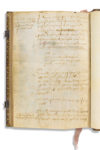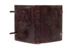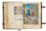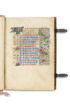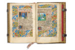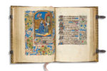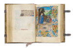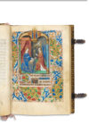 (4+1), 13-148, 157 (8-1), 16-228, 233 (4-1 blank) + iv. Foliation modern des crayons. - Surface d'écriture : 95 x 65mm. Unecolonne de 16 lignes, réglée en rouge. Écrit à l'encre marron foncé en écriture Textura gothique ; Calendrier en rouge, bleu, et en or ; rubriques en rouge ; majuscules touchées en jaune. - Des centaines d'initiales de 1 à 2 lignes ornées de feuilles d'or, remplies et bordées de bleu et de rouge foncé alternés, des terminaisons de lignes au même palette ; Des dizaines d'initiales de 2-à-3 lignes en grisaille sur une base d'or liquide et rempli avec des f leurs, feuilles, et fruits et aux cadres de rouge avec filigrane en or ; 31 miniatures dont 19 petites (de 6 lignes) et 12 grande (1/2 page). Feuilles ornées de grandes miniatures dans des bordures pleines et feuilles ornées de petites miniatures dans des bordures aux trois quarts. Bordures composées de formes géométriques alternées d'or liquide avec fruits et f leurs ou d'acanthe tourbillonnante d'or liquide et de bleu avec des besants audacieux brunis. - Tout le volume, en outre, est en parfait état de conservation, à l'exception du f. 116 avec une petite déchirure dans le parchemin au niveau de la gouttière et quelques rares taches brunes ; la première feuille des Heures de la Croix a été retirée entre les ff. 113-114 et une plus grande tache brune dans la marge inférieure des ff. 80-82. - Maroquin violet à longs grains, dos et plats ornés à froid, milieux, doubles gardes de moire rouge, dentelle intérieure, tranches dorées, fermoirs (Simier). Ce superbe manuscrit de la seconde moitié du XVe siècle possède un texte richement enluminé de trente-et-une miniatures, aussi gracieuses que délicates, dues à l'habile pinceau d'un artiste de l'École parisienne, émule du célèbre Jacques de Besançon. Texte-ff. 1-12 : Calendrier richement ornés, sur leur recto, d'une charmante bordure formée d'un léger rinceau où l'or se mêle agréablement à la couleur ; les saints en or comprise : (jan.) Fabian & Sebastien, Vincent, Conversion de St. Paul ; (fev.) Purification de la Vierge, Cathedra de St. Pierre, Matthias ; (mar.) Marc ; (mai) Philippe & Jacob, Jean à la Porte Latin ; (juin) Barnabe, Nativité de St. Jean, Pierre & Paul apôtres ; (juil.) Margueritte, Marie Magdalen, Jacob, Anne ; (aout) Pierre advincula, Stephane, Laurence,Assumption de la Vierge, Bartholomew, Decapitation de Jean le Baptiste ; (sept.) Nativité de la Vierge, Matthieu, Michel Archange ; (oct.) Luc, Simon & Jude ; (nov.) Martin, Catherine,André ; (dec.) Nicolas, Conception de la Vierge, Thomas, Nativité de Dieu, Stephan, Jean, Thomas ; (ff. 13-18v) Extraits des Évangiles ; (ff. 19-22v) Obsecro te, en utilisant la forme masculine pour « famulo tuo » ; ; (ff. 22v-25) O intemerata, en utilisant la forme masculine pour « peccatori » ; (f. 25v) blanc ; (ff. 26-95) Heures de la Vierge : (ff. 26-46v) Matines ; (ff. 47-58) Laudes ; (ff. 59-63) Prime ; (ff. 63v-67v) Tierce ; (ff. 68-72) Sexte ; (ff. 72v-76v) None ; (ff. 77-84) Vêpres ; (ff. 84v-95) Complies ; (ff. 95v) blanc ; (ff. 96-108v) Psaumes pénitentiels ; (ff. 108v-113v) Litanies ; (ff. 114-123) Heures de la Croix et Heures du Saint-Esprit combinées et abrégées : (f. 114) Matines ; (ff. 122v-123) Complies ; (ff. 124-167) Heures des Morts : (f. 124) Vêpres ; (ff. 167v-176v) Suffrages des Saints : (f. 167v) St. Michel ; (f. 168) St. Jean-Baptiste ; (f. 168v) St. Jean-Évangéliste ; (f. 169) St. Jacques ; (f. 169v) St. Christophe ; (f. 171) St. Antoine ; (f. 171v) St. Sébastien ; (f. 173) St. Laurent ; (f. 173v) Ste. Denise Anty ; (f. 174) St. Étienne ; (f. 174v) Ste. Catherine ; (f. 175) Ste. Barbe ; (f. 176) Ste. Marguerite ; (f. 176v) Ste. Geneviève. ENLUMINURE Le Maitre de Jacques de Besançon (fl. 1480-1498) était un enlumineur parisien à la fin du 15e siècle et était parmi les plus demandés de son époque. Son style a inspiré de nombreux artistes, comme celui que l'on retrouve à l'oeuvre dans le présent manuscrit. Le Maitre de Jacques de Besançon a travaillé pour les commissions de luxe pour les bibliophiles royales ainsi que les oeuvres fait pour le marché. Notre artiste travaille dans le style de ce maître, mais avec une finesse un peu moindre. De belles et larges bordures, aux rinceaux de nuances chatoyantes, encadrent et accompagnent toutes ces compositions. Le texte, enrichi de nombreuses fins de lignes et d'initiales rubriquées, fait de ce volume un Livre d'Heures parisien remarquable et très artistique. MINIATURES 1. f. 13 Grande miniature : St. Jean dans l'île de Patmos écrivant son Évangile 2. f. 15 St. Luc 3. f. 16v St. Mathieu 4. f. 18 St. Marc 5. f. 19 la Vierge à l'Enfant 6. f. 22v