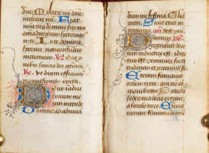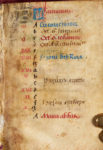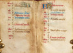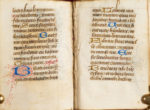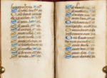 107(6+1), 116, 1212, 134, 143(2+1), 156, 167(6+1), 1712, 184, 1912, 206, 218. Surface d'écriture : c. 53 x c. 30 mm. 14 lignes, 1 colonne, réglées en brun rougeâtre. Écriture bâtarde à l'encre brun foncé ; calendrier en rouge, bleu et brun ; rubriques en rouge ; capitales touchées en jaune ; le scribe jouant parfois avec les ascendants pour créer des coeurs et autres boucles décoratives. - Des centaines d'initiales à une ligne en feuille d'or et en bleu alternés ; des douzaines d'initiales à deux lignes en bleu avec des tracés filigranes rouges alternant avec des initiales en feuille d'or remplies de tracés filigranes noirs ; le décor de tracés monte parfois le long des bordures ; six initiales à trois lignes en feuille d'or et en bleu avec des tracés filigranes rouges et noirs ; des remplissages de fin de ligne en feuille d'or et en bleu, sous forme de barres ou de formes florales ; des blancs indiquent des miniatures prévues mais non exécutées et des initiales décorées à des sections de texte importantes (ff. 14, 18v, 25, 51v, 53v, 89, 111, 153, 154, 155v, 157, 158v, 159v). - L'ensemble était émargé sur les bords lors de la reliure ; parchemin quelque peu fragile avec quelques craquelures à la gouttière ; certains feuillets des deuxième et troisième cahiers (à partir des ff. 13-24) mal reliés ; taches à travers les ff. 45v-46 ; abrasion à l'initiale et écaillage à la feuille d'or au f. 154v ; plusieurs initiales avec saignement d'encre, obscurcissant les tracés, probablement à cause de l'exposition à des liquides ; taches brunes minimes à la fin du livre (dernier cahier). - Reliure en velours violet avec de légères marques d'usure, bords en rouge. UN PETIT LIVRE DE PRIÈRES À L'USAGE D'ANGERS, REMPLI DE JOLIES LETTRES FILIGRANÉES. UNE SÉRIE DE MINIATURES AVEC DES INITIALES DÉCORÉES ET RELIÉES ENTRE ELLES ÉTAIT PRÉVUE POUR CE LIVRE MAIS N'A JAMAIS ÉTÉ EXÉCUTÉE. À LA FIN DU XVIIIe OU AU DÉBUT DU XIXe SIÈCLE, LE LIVRE EST ENTRÉ DANS LA COLLECTION ESTIMÉE DU BIBLIOPHILE,EXPERT EN COSTUMES ET RÉDACTEUR DU JOURNAL DES DAMES ET DES MODES, PIERRE DE LA MÉSANGÈRE. TEXTE - ff. 1-12v : Calendrier, avec SS. Licinus, évêque d'Angers (13 février),Albinus, évêque d'Angers (1er mars), Maurilius, évêque d'Angers (13 septembre), Renatus, évêque d'Angers (12 novembre). - f. 13 : Fin erronée de Obsecro te (devrait suivre le f. 24) : ...as et suscipias et vitam eternam michi tribuas. Audi et exaudi me dulcissima Maria mater dei et misericordie. Amen.-f. 13r/v : Salve regina. - f. 14r/v : Stabat mater dolorossa...supplico (le reste du texte suit au f. 23). - ff. 15-17 : Extrait de l'Évangile de Jean. - ff. 17v-22v : Obsecro te (famulo tuo en forme masculine), jusqu'à (le reste mal relié au f. 13) : Et hanc orationem supplicem exaudi... - f. 23-24 : Suite du Stabat mater du f. 14v :... Quis non posset. - ff. 25-87v : Heures de la Vierge avec intégration des Heures de la Croix et des Heures du Saint-Esprit : Heures de la Vierge : (f. 25),Matines, (38v), Laudes ; Matines : (f. 52) Heures de la Croix, (f. 53v) Heures du Saint-Esprit ; Prime : (f. 54v) Vierge, (f. 61) Croix, (f. 61v), Saint-Esprit ; Terce : (f. 62) Vierge, (f. 66) Croix, (f. 66v) Saint-Esprit ; Sixième : (f. 67) Vierge, (f. 71) Croix, (f. 71- 71v) Saint- Esprit ; Sixième : (f. 67) Vierge, (f. 71) Croix, (f. 71-71v) Saint-Esprit ; None : (f. 71v) Vierge, (f. 75v) Croix, (f. 76) Saint- Esprit ; Vêpres : (f. 76v) Vierge, (f. 80) Croix, (f. 80v) Saint-Esprit ; Complies : (f.. 80v) Vierge, (f. 86v) Croix, (f. 87) Saint-Esprit. - f. 88 : blanc ligné. - f. 88v-104v : Psaumes de pénitence. - ff. 104v-110v : Litanie : y compris SS. Maurillius et Renatus. - ff. 111v-152v : Office des morts : (f. 111v) Vêpres, (f. 117) Matines, (f. 147) Laudes. - ff. 153-160 : Suffrages des saints : (f. 153) Michel, (f. 154) Christophe, (155v) S PROVENANCE Réalisé à l'usage d'Angers avec des saints angevins présents dans le calendrier et la litanie. L'Obsecro te utilise la forme masculine de famulo tuo ; Pierre de la Mésangère (1761-1831), fondateur et rédacteur du Journal des dames et des modes ; vendu à Paris par De Bure Frères en 1831 ; Mondidier, Henri de Varenne, son no. 3714 d'après la note sur le premier contre-garde, qui se lit comme suit : « N°3714 de la bibliothèque de Henri de Varenne (acheté à Paris 1831). Ce petit livre a appartenu à M. de la Mésangère, dont la signature autographe se trouve à la fin. Les manuscrits sur vélin, dans un si petit format, sont assez rares. Ce petit manuscrit ne contient que (?) d'Eglise. Henri de Varenne à Mondidier » ; Europe, collection privée.