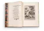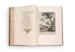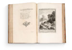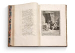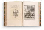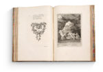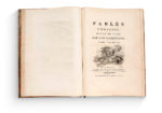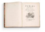 l'époque, dos à 6 nerfs ornés, pièces d'auteur et titre verte, de tomaison verte ornée d'un fer doré au motif de coeur, caissons richement ornés, filet, guirlandes et grand fers dorés à volutes et motifs floraux sur les plats, filets dorés sur les coupes et coiffes, roulette dorée sur les chasses, tranches marbrées et dorées. 2 ff., XXX-XVIII-124 pp., frontispice et 70 planches ; 2 ff., II-135 pp., 68 planches ; 2 ff., IV-146 pp., 68 planches et 2 ff., II-188 pp., 69 planches. Magnifique édition illustrée par le célèbre peintre animalier Jean- Baptiste Oudry (1686-1755) considérée comme la plus célèbre et la plus belle des éditions illustrées des Fables. Entreprise par Regnard de Montenault qui avait acquis les dessins d'Oudry vers 1751. Il confia la tâche à Charles-Nicolas Cochin de les agrandir et les adapter afin qu'ils puissent être gravés. Exemplaire de tout premier tirage, sur Hollande. Avec la bannière muette à la planche du léopard, illustrant Le Singe et le Léopard (tome III, fable CLXXII). Dans une superbe reliure en maroquin orné de l'époque. Ouvrage illustré d'un frontispice en noir par J. B. Oudry, terminé au burin par N. Dupuis et gravé à l'eau forte par C.N. Cochin le fils, et de 275 eaux-fortes en noir d'après les dessins d'Oudry gravées par Auber, Baquoy, Beauvais, Chedel, Chenu, Cochin, Elisabeth Cousinet, Duret, Fessard, Pasquier, Prévost, Tardieu et autres... Précédé d'une « Vie de La Fontaine » par Montenault. Un des projets les plus ambitieux du XVIIIe siècle pour l'illustration d'un texte littéraire. Seuls mille exemplaires furent imprimés, dont seulement cent exceptionnels exemplaires de tête sur grand papier. «Magnifique ouvrage... Les exemplaires les plus recherchés comme épreuves sont ceux où (tome III, p. 113), dans la figure de la fable Le Singe et le Léopard, la banderole se trouve avant les mots Le léopard», Cohen, 548-550. Tchemerzine, III, 874-875, «édition magnifique...par les meilleurs graveurs du temps”. BnF, Des Livres rares..., 207. Provenance : Ex-libris R. Descamps Scrive (fer doré sur fond bleu foncé à la première garde du tome 1). Coins, coiffes, nerfs et coupes légèrement frottés, quelques rousseurs mais bel exemplaire.