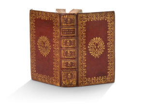 encadrement de roulettes et filets dorés au plats, armes dorées frappées au centre, roulette dorée aux contregardes, tranches dorées. Aux armes de Madame Adélaïde, fille ainée de Louis XV (1732-1800). ‘'Mesdames de France [Marie-Adélaïde, Victoire-Louise-Marie- Thérèse et Sophie-Philippine-ElisaBeth-Justine] avaient chacune leur propre bibliothèque, dont les volumes furent, en grande partie, habillés par Fournier, libraire et relieur à Versailles''. (Guigard, 103). Rousseurs et petites taches, petits manques pp. LI-LII, 265-266 mais bon exemplaire.