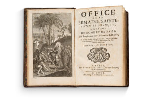 OFFICE DE LA SEMAINE SAINTE, latin et françois à l'usage de Rome et de Paris... Nouvelle édition. Paris, Antoine Dezallier, 1701. In-8, 4 ff. (dont frontispice), XXXII-653-(3) pp. Maroquin rouge strictement de l'époque, dos à 5 nerfs, chiffres...