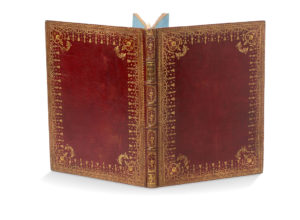rouge (10 x 16 cm), complet et à belles marges. Maroquin rouge de l'époque, large dentelle à petits fers alternant pampilles, végétaux et roulettes dorées en encadrement sur les plats, fers dorés de coeurs renfermant la couronne de France en écoinçons, dos à nerfs orné, pièce de titre de maroquin olive, titre doré, guirlande aux contreplats, roulette dorée sur les plats, gardes de tabis de soie bleue, tranches marbrées et dorées. Très beau maroquin de l'époque. Recueil des prières de messe écrit en grands caractères ronds, imitant les livres liturgiques. Manuscrit séculier destiné à un particulier, en français et latin, orné d'une lettre initiale peinte IHS, de 4 en-têtes en bandeaux et de 8 culs-de-lampe, parfois faits au pochoir et peints en or et couleurs dont une grande figure à l'Agneau pascal ornée. Le texte est calligraphié en noir et bleu avec titres et indications en rouge et rehauts dorés, 8 lignes par page. Certainement réalisé sur commande, il n'est ni daté ni signé mais les types de pochoir utilisés pourraient faire pencher pour la seconde moitié du XVIIIe. Contenu : Elévations.., pp. 1-45 ; A la Consecratio, pp. 46-48 ; A l'élevation de la S.Hostie, pp. 49-50 et A l'elevation du Calice, pp 51-79. Légers frottements à la reliure, quelques piqures marginales et légère oxydation homogène du papier mais bel ex resté frais.