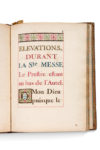[MANUSCRIT LITURGIQUE ENLUMINÉ]. [Prières de la Messe]. “Élévations durant la S.te Messe. Le Prestre étant au bas de l'hotel...” (ca 1750-1780). Petit in-4. 79 pp. numérotées, texte calligraphié sur papier vergé, encadré à l'encre...