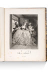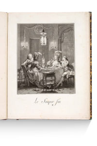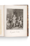 petits coins de vélin vert de la seconde moitié du XIXe, dos à nerfs orné de caissons et filets dorés dans le goût de l'époque, titre doré, gardes de papier peigne, plats soulignés d'un triple filet doré. Un seul titre encadré et 26 planches gravées en noir. À belles marges, signatures gravées. 24 gravures sont de Moreau, 2 de Freudeberg. 11 sont gravées A.P.D.R. (avec privilège du Roi), les planches 4 et 24 sans signature gravée et signé “Moreau junior” à la planche 19. Particulièrement rare et recherché, notamment les planches réunies et avec de belles marges. Premier tirage. Toutes les figures sont en belles épreuves. En 1773, Jean-Henri Eberts (1726-1793), banquier, marchand d'art, amateur de gravures, veut publier un recueil des modes qui paraîtrait annuellement sous forme de livraisons de douze estampes, accompagnées d'un texte explicatif. Pour la première suite, qui devait décrire les étapes de la journée d'une galante parisienne, il fit appel à Freudeberg qui laisse inachevé le projet. Eberts se tourne vers le brillant dessinateur et graveur, Moreau dit le Jeune, qui connaît bien la société parisienne. La suite, “d'esprit rousseauiste”, présentera les étapes de la maternité ou, en pleine vogue d''anglomanie, retrace les loisirs d'un petit maître. Les gravures seront de Launay, Malbest, Baquoy, Guttenberg... Cette suite ne paraitra d'abord qu'en feuilles avec les gravures seules (première édition avec les notices de Restif de La Bretonne en 1789). La Révolution fait oublier ces estampes qui flattent l'aristocratie déchue, il faut attendre Edmond de Goncourt pour redécouvrir cette magnifique suite iconographico-sociale devenu un incontournable de l'histoire de la mode et des moeurs au XVIIIe siècle. Titres des gravures : Oui et Non. La Sortie de l'opéra. Le Souper fin. La Matinée. La Déclaration de grossesse. Les Précautions. J'en accepte l'heureux... N'ayez pas peur. C'est un fils Monsieur. Les Petits parrains. la Course de chevaux. Le Seigneur chez son fermier. Les Délices de la maternité. Le rendez-vous de Marly. les Adieux. La Rencontre au bois. La Dame du Palais. Le Lever. La petite toilette. La Grande toilette. La partie de Wisch. La Petite loge. Le Pari gagné. La Surprise. L'accord parfait. Le Vrai bonheur. Des rousseurs, discrètes petites restaurations au bord de quelques gravures. Légères salissures d'usage. Une planche (24) brunie.