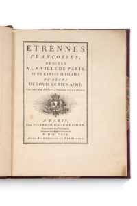 PETITY (Abbé). Etrennes françoises dédiées à la ville de Paris pour l'année jubilaire ou cinquantième du règne de Louis le bien-Aimé. À Paris, Pierre-Guillaume Simon, 1766. In-4. (13)-68 pp., texte encadré, à très grandes marges....