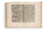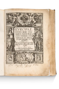 (titre, dédicace, préface), 50 cartes, [1] f. (index). Vélin souple de l'époque, dos lisse muet. Cet atlas comporte une page de titre gravée et 50 planches gravées sur cuivre en noir à double page cartographiant l'Europe, dont plusieurs sont ornées de portraits en médaillon de souverains et des armoiries des pays représentés. De nombreuses cartes sont des versions réduites des cartes d'Ortelius. Au colophon : “Coloniae-Typis Lamberti Andreae, sumptibus vero Joannis Buchsemechers.-Anno M. D. XCIII” Note en latin au titre. Philips, I, [2828]. Garde et doublure de contreplat supérieures renouvelées, salissures et taches, lacets/fermoirs manquants, titre restauré, légères rousseurs, légères mouillures marginales.