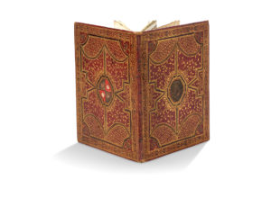 Venise, 1684-1685. Petit in-4. 21 ff., réglés et calligraphiés à a plume, encadrés d'un motif f loral peint, dont 9 ff. seulement sont ornés et manuscrits. Maroquin rouge de l'époque entièrement mosaïqué et à compartiments, noir et doré avec des éléments peints, plats ornés de compartiments géométriques alternant bandes noires et dorées et éventails en écoinçons décorsé au crible ou de fers à motifs floraux au centre, le tout encadré d'une guirlande dorée au crible et mosaïquée, dos lisse, tranches dorées. Superbe maroquin italien du XVIIe au Lion de St Marc et aux armes des Bettoni peints au centre des plats. Petits travaux de vers discrets au bas de certains ff. sans atteinte au texte ou à l'image. Légère usure partielle des armes peintes à la reliure. Très légère rétractation et salissures du vélin. DESCRIPTION Texte en italien d'une écriture ronde, calligraphiée en italique. Complet de 9 ff. manuscrits à l'encre brune ou à l'or, entre 15 à 19 lignes par pages, chacune avec un encadrement floral et réhaussé d'or, peint à la main. 3 lettrines ornés de motifs floraux monochrome et peintes à l'or. Des lettrines et culs-de lampes calligraphiés à l'encre, parfois avec rehauts d'or. Un belle figure peinte, en frontispice, en couleurs avec rehauts d'or, aux grandes armes des Bettoni, surmontées de cartouches avec le Lion de St Marc représentant Venise et la figure de la Justice en femme. Une figure peinte au verso du ff. 6, aux grandes armes de 3 blasons des principales familles patriciennes, surmontés des armes de Marcantonio Giustinian alors 107e doge de Venise et de la corne ducale du Doge. Ornements à la grotesque. CONTENU Ce manuscrit sur vélin est le texte écrit, daté et signé, du contrat, ou “achat”, passé en 1684, par Lorenzo Bettoni auprès de la Sérénissime cité de Venise et la Banco Giro afin que sa famille soit anoblie. Les Bettoni elle fut la première famille à délier sa bourse afin de financer la guerre de la République de Venise contre les turcs ottomans et ainsi accéder, en offrant 10 000 ducats, à la noblesse vénitienne. Le document contient les montants chiffrés du “contrat” ou achat des titres. Les figures peintes sont un peu malhabiles mais lisibles et correctement mises en coloris.