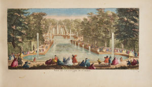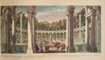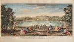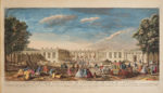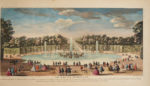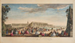 (entre 1755 et 1820). Demi-veau bleu postérieur, dos lisse orné, titre doré. In-folio oblong (35 x 55 cm). 59 planches gravées d'après Jacques Rigaud, toutes entièrement mises en couleurs. La plupart des planches sont numérotées. Suite particulièrement recherchée en couleurs. Beau recueil de 59 belles vues-perspectives agrémentées de personnages, dessinées d'après nature et gravées à l'eau-forte par Jacques Rigaud et/ou son neveu Jean-Baptiste, joliment mises en couleurs et montées sur onglets. Représentant des vues ou scènes de Paris et des environs de Paris, Versailles, St Cloud, Meudon et Chantilly. Elles évoquent les palais royaux français, les châteaux et jardins ou parcs ornementaux, les monuments... Une des suites les plus célèbres du XVIIIe siècle français. Démarrée en 1730 par Jacques Rigaud (1680-1754), dessinateur et graveur au style délicat et élégant, et terminée par son neveu et successeur, Jean-Baptiste, cette suite renouvelle le genre de la vue pittoresque par un souci du détail et des problématiques de champs et perspective ainsi que par le choix du format oblong semblant préparer le goût des panoramas qui fleurira avec des artistes comme Carmontelle pour se multiplier au siècle suivant. Dans un premier temps, Rigaud vendait ses vues à la pièce, puis elles furent réunies en recueil à partir de 1753 ou 1755, chacun comptant un nombre de planches différent, l'ensemble annoncé par un feuillet de titre gravé. L'ouvrage connut 3 tirages, le dernier chez Treuttel et Würtz vers 1820. Si la lettre varie, la scène gravée est toujours de même format. Mais il reste difficile d'être précis bibliographiquement sur cette suite restée très rare. Cohen, 895. Reliure frottée, incomplet du titre. Légère oxydation homogène des planches.