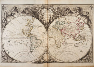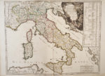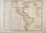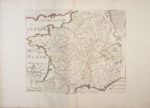 avec lacets de tissu, dos lisse orné de roulettes et fleurons dorés, titre doré, triple filet doré en encadrement sur les plats, roulette dorée en encadrement sur les contreplats, tranches dorées. Atlas composite réunissant 45 cartes françaises du XVIIIe siècle illustrant l'Europe : 20 cartes de Robert de Vaugondy d'après Sanson publiées à Paris entre 1730 et 1745, principalement chez le Sr. Robert, quai de l'Horloge, comprenant une Mappemonde (1743), les cartes de l'Europe (1738), de l'Asie (1739), de l'Afrique (1741), du Nouveau Continent ou l'Amérique (1740) montrant la Californie comme une île, de la France (1741), ainsi que de nombreuses cartes régionales : La Lorraine (1740), l'Empire d'Allemagne (1745), l'Italie (1743), la Corse et la Sardaigne (1731), et plusieurs cartes ecclésiastiques de Metz, Toul et Verdun. 15 cartes de Guillaume Delisle publiées à Paris entre 1703 et 1717 dont la carte de Suisse (1713), des cartes du cours du Rhin,Flandre, Artois, Brabant, Hainaut, Danemark, Moscovie (en deux feuilles), Hongrie, Grèce, Sicile, et les Couronnes du Nord dédiées à Charles XII de Suède (en deux feuilles). 9 cartes de Jaillot publiées entre 1700 et 1728, comprenant 8 cartes de Hubert Jaillot illustrant la Lorraine, la Provence, le Dauphiné, les États de la Couronne de Pologne, les Provinces des Pays-Bas, les Îles Britanniques, l'Espagne et une carte des Îles de Malte, de Goze et du Cuming par B. Antoine Jaillot. Une carte d'une partie du diocèse et archevêché de Cologne par Nicolas Sanson publié à Paris chez P. Mariette en 1703. Belle reliure en beau maroquin souple de l'époque malgré une restauration très discrète en tête de mors supérieur, lacets remplacés, quelques petites taches. Petits défauts marginaux sur certaines cartes dont mouillures et restaurations très discrètes, la dernière carte légèrement oxydée, 3 cartes légèrement froissées, très légères salissures.