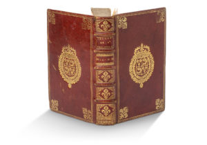 caissons richement ornés, titre et tomaison dorés, triple filet doré encadrant les plats avec 4 fleurs de lys en écoinçons, armes frappées au centre, roulette dorée sur les chasses, tranches dorées. Bel exemplaire relié aux armes du Dauphin Louis de France, fils de Louis XV.