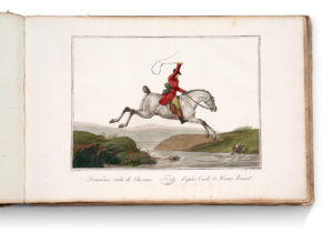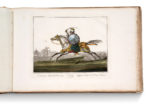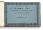 eaux-fortes et aquatintes titrées imprimées en noir et mises en couleurs à l'époque. Cartonnage rose marbré de l'époque, dos lisse, pièce de titre verte. Cachet autographe de l'éditeur au verso du titre. Première de couverture imprimée sur papier bleu conservée. Très belle suite de figures équestres gravées. 54 planches toutes numérotées (2 planches différentes numérotées 8 dont 1 corrigée “20” au crayon), titrées en français et anglais au bas des illustrations. Estampes consacrées à l'art militaire, à la chasse ou aux courses. Comme pour de nombreuses suites gravées anciennes le nombre de planches par exemplaire varie, certains comprennent 36, 48 ou 55 planches. C'est donc un titre sans nombre standardisé dont notre exemplaire peut-être considéré comme des plus complets. Provenance : Ex-libris Henri Gallice (1853-1930), encyclopédiste et figure de la culture viticole champenoise. « Cet album, infiniment rare, surtout en couleurs, est une des plus belles productions de Carle et Horace Vernet [...] Il est à peu près impossible de trouver aujourd'hui une série complète en couleurs, les marchands d'estampes et les amateurs s'étant chargés de dépecer les exemplaires» (Thiébaud). Mennessier de La Lance, II, 617-618. Plats et dos passés, coupes et coins frottés, rousseurs disséminées, pl. 51 restaurée dans la marge latérale droite, pl. 51-54 déreliées.