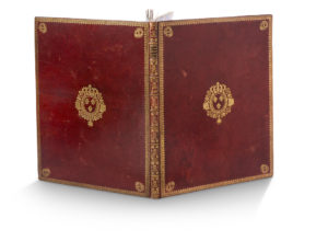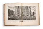 ville de Strasbourg. Paris, Laurent Aubert, [1745]. In-plano. Maroquin rouge strictement de l'époque aux armes dorées poussées au centre des plats, dos à nerfs orné de caissons fleurdelisés dorés, guirlande et dentelle dorées en encadrement sur les plats, armes dorées en écoinçons, roulette dorée aux contreplats, tranches dorées, gardes de papier marbré de type coquille caillouté avec raccords du relieur pour la dimension. Originale et unique édition ancienne de ce superbe livre publié par la ville de Strasbourg pour commémorer les fêtes qu'elle offrit à Louis XV, du 5 ou 10 octobre 1744, dans le contexte de la guerre contre les Flandres et suite à la célèbre “maladie de Metz” ou le roi crut mourir et dont il se rétablit presque miraculeusement. Entièrement gravé, il est un des plus beaux livres de fêtes français qui soit et un des plus beaux livres sur Strasbourg. Il constitua à l'époque une entreprise ruineuse. Aux grandes armes du roi Louis XV poussées au centre des plats. OHR 2495, n° 10. Dans un maroquin signé de Padeloup. Reliure réalisée par Antoine-Michel Padeloup (1685-1758) dit le Jeune, avec son étiquette de type B (consécutive à sa nomination officielle comme relieur du Roi en 1733), collée au bas de la page de titre. Les armes dorées en écoinçons, reprises au titre gravé, sont celles de la ville de “Strasbourg libre d'Empire”, une des anciennes représentations variant sensiblement de celle connue. L'ouvrage est orné d'un titre gravé à encadrement par Marvye d'après le Parmentier, du grand portrait équestre de Louis XV gravé par J. G. Wille d'après Parrocel, de 11 planches doubles dessinées par Weis et gravées par Le Parmentier ou Le Bas, de deux jolies vignettes en tête et de 20 pages de texte gravé avec encadrement rocaille et fleurons variés. La planche 10 gravée par Weis. Le texte entièrement gravé par Le Parmentier. Petites usures et taches à la reliure, une épidermure légère au premier plat, petits frottements au second. Légères oxydations au papier. PROVENANCE Bibliothèque de Edouard-Désiré Massicot (1845-1903) “globe trotter Bibliomane”, négociant orléanais impliqué dans le développement de la Champagne et son rayonnement viticole, avec son ex libris au planisphère à la première garde.