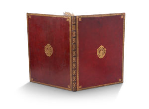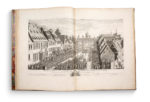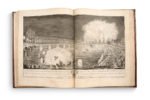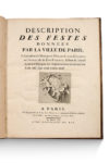 de l’époque aux armes, dos orné de caissons fleurdelisés, dentelles dorées en encadrement sur les plats, fleurs de lys dorées en écoinçons, roulette dorée aux contreplats. (2)-22 pp., 13 grandes planches dont 8 à double-page par Blondel, grande vignette au titre, grand bandeau gravé par Rigaud représentant les joutes données sur la Seine à l’occasion de la célébration. A toutes marges. Très rare. Très bel exemplaire aux armes de la Ville de Paris. Le libraire Le Mercier publia 1400 exemplaires de l’ouvrage, la plupart reliés en veau ou en maroquin aux armes de la Ville de Paris. Complet de la spectaculaire vue panoramique, depuis la Seine, le long du Louvre, des feux d’artifices tirés au coeur de la capitale pour la célébration. Le Mercure de France, émerveillé, donne une description éblouissante d’une fête « restée dans la mémoire de plus de 500 mille spectateurs », la volonté d’en graver le souvenir se fait aussitôt. Turgot, Prévôt des marchands, commande à Blondel des gravures de grand format pour commémorer des festivités comptant parmi les plus importantes du siècle. Superbes vues gravées de feux d’artifices et réjouissances. Petites usures et taches discrètes à la reliure. Cohen, 288