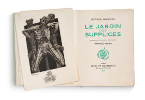 FREIDA. MIRBEAU, Octave. Le Jardin des supplices. Paris, Javal et Bourdeaux, 1927. XVIII-204-[1] pp. Au format petit in-folio carré. Sous couverture vert d'eau imprimée à rabats sous cristal et chemise cartonnée de papier dominoté argent de...