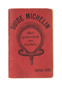 Exemplaire de la première édition du prestigieux guide gastronomique datant de 1900, objet publicitaire alors offert aux chauffeurs par la marque de pneumatiques. Tiré à 35 000 exemplaires seulement, ce premier guide est aujourd'hui une véritable rareté . Gratuit jusqu'en 1922, il deviendra payant puis distinguera les meilleurs restaurants par des étoiles à partir de 1926. Michelin avait pour vocation d'aider l'automobiliste à «appovisionner son automobile, pour la réparer, lui permettre de se loger et de se nourrir » (in Avant-propos). Après quelques conseils mécaniques sont listées les villes de France avec leurs «Dépôts d'Essence» et cafés ou restaurants, puis des conseils techniques selon les modèles de voiture... En français dans le texte, 327. Quelques graffiti au crayon sur les pages, sans gravité. Dérelié, quelques salissures discrètes et une pliure centrale à la couverture. GASTRONOMIE.