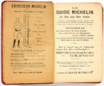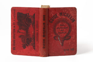 l'éditeur, plats estampés en noir dont une publicité Dion-Bouton & Cie estampée à la 4e de couverture. Exemplaire de la 3e année du guide mythique. Bien complet de sa carte de France dépliante en couleurs. 1902 est la première année éditée avec une carte jointe. Premiers guides touristiques modernes, les guides automobiles Michelin comportent des plans de villes, des indications sur les itinéraires à choisir, des listes de garages, stations-service, hôtels. S'adressant aux «chauffeurs», le guide leur demande leur avis et s'engage à «rayer impitoyablement des listes tous les hôtels dont ils nous signaleront comme défectueux la table, la chambre, les W. C., le service ; les dépôts (...) mal approvisionnés ; les dépositaires du stock Michelin dont ils auraient eu sérieusement à se plaindre». En français dans le texte, 327. Reliure un peu tachée ou mouillée, légère oxydation du papier. Quelques graffitis au crayon sur les pages, sans gravité. GASTRONOMIE.