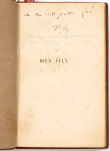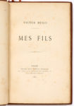 HUGO, Victor. Mes Fils. Paris, Michel Lévy frères, 1874. In-8. (4)-48 pp. Basane fauve moderne, dos à nerfs soulignés de filets à froid, pièce de titre et de tomaison de basane rouge, titre doré, filets dorés, couverture conservée. Édition...