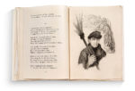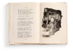 rempliée au plat imprimé, l'ensemble sous chemise cartonnée illustrée en couleurs de l'éditeur, titre au dos, serpentes. Édition illustrée de 30 belles eaux-fortes en noir, par l'artiste et buriniste Lela Pascali. Tirage limité à 197 exemplaires, celui-ci un des 5 sur Japon Impérial (n° 14). Exceptionnel exemplaire enrichi. Comprend un des cuivres de l'artiste (18 x 26,2 cm), un dessin original de la gravure pp. 117, un croquis sur calque signé de l'artiste, une suite en premier état et une suite des hors-textes en état définitif avec remarques sur Japon Impérial. Première édition des Soliloques à ne pas être illustrée par Steinlen qui en fit les images depuis l'originale parue à compte d'auteur en 1897, soit une vraie rupture pour l'esthétique des célèbres vers. Recueil poétique de Randon (1867-1933), dit Jehan-Rictus à partir des années 20, chantre du parler populaire parisien. Il regroupe des pièces « dans la langue du peuple », placées dans la bouche d'un sans-abri errant de rues en rues. Chemise cartonnée endommagée notamment aux mors, etui absent et quelques discrètes rousseurs mais exemplaire à l'intérieur resté frais. ILLUSTRÉ MODERNE. POÉSIE POPULAIRE. PARIS.