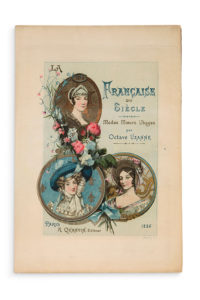 UZANNE, Octave. La Française du siècle. Paris, Quantin, 1886. Grand in-4. Broché à rabats, couverture illustrée, sous chemise cartonnée de papier japon estampé dans le goût de l'époque, deux larges rubans de satin bordeaux passants pour...