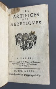 [ESTRIX (Gilles) ; RAPIN (René), trad.)]. Les artifices des hérétiques. A Paris, chez S. Mabre-Cramoisy, 1681. In-12, [6] f., 444 p., basane havane époque, dos à 4 nerfs, titre doré, caissons ornés, tranches jaspées (2 coins usés, tache en...