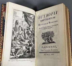 EUTROPE. Eutropii Breviarium historiae romanae. Accedunt selectae lectiones dilucidando auctori appositae. Parisiis, typis J. Barbou, 1754. In-12, XXVIII-221 p., fr., fig., maroquin rouge époque, dos à 5 nerfs, caissons ornés, titre doré, triple...