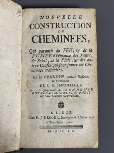 GENNETÉ (Claude Léopold). Nouvelle construction de cheminées qui garantit du feu & de la fumée, à l'épreuve des vents, du soleil, de la pluie, & des autres causes qui font fumer les cheminées ordinaires... A Liege, chez F. J. Desoer, 1760....