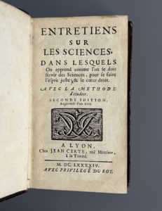[LAMY (Bernard)]. Entretiens sur les sciences, dans lesquels on apprend comme l'on se doit servir des sciences pour se faire l'esprit juste et le coeur droit, avec la méthode d'étudier. A Lyon, chez Jean Certe, 1694. In-12, [12] f., 400 p., [16] f....