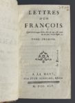 [LE BLANC (Jean-Bernard)]. Lettres d'un François. A La Haye, chez J. Neaulme, 1745. 3 volumes in-12, demi-veau fauve moucheté époque, dos à 5 nerfs, pièce de titre maroquin rouge, tomaison frappée sur fond noir, caissons ornés, armoiries...