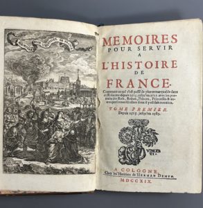 il y est fait mention. A Cologne, chez les héritiers de H. Demen, 1719. Deux volumes in-8, veau havane époque, dos à 5 nerfs, pièce de titre maroquin fauve, caissons or,és, roulette dorée aux coupes, tranches jaspées, habiles restaurations (menus défauts, brunissures). Edition illustrée d'un frontispice répété et de 33 planches de portraits gravés sur cuivre, la plupart signés par Harrewyn. « Les curieux recherchent toujours cette édition des Mamoires, parce que l'abbé Lenglet a fait des suppressions dans celles qu'il a publiées » (Barbier III, 236).