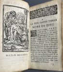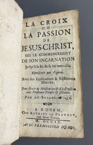 méditation & d'instruction aux personnes pieuses & dévotes. Par un ecclésiastique. A Rouen, chez A. Le Prevost, 1709. In-12, [6] f., 176 p., (2] f. approb., errata), fig., parchemin souple époque, dos lisse, titre à l'encre (ex. manié sans gravité, rousseurs et qq. taches, mouill. très pâle). Rare témoignage de piété populaire, cet ouvrage imprimé à Rouen est illustré dans le texte de 31 figures gravées sur bois, dont 17 signées par Pierre Le Sueur. Il s'agit de l'un des trois graveurs sur bois établis à Rouen exerçant à l'époque, qui tous portent le même prénom. Quelques rares annotations anciennes, et ajouts en marge de l'errata. Touchant ex-libris manuscrit au contreplat : « 1780 ce livre a partien a la fame de piere crapet... ».