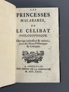 [LONGUE (Louis Pierre de)]. Les princesses malabares, ou Le célibat philosophique.... A Amsterdam, aux dépens de la Compagnie, 1735. In-12, [7] f., 202 p., [3] f., maroquin brun à coins, dos à 5 nerfs, titre, fleurons et date dorés, double filet...
