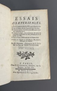 mors fendu, une coiffe découverte ; lég. rouss.). Première édition en français de cet ouvrage consacré à cinq sujets : I. Sur la fermentation des mélanges alimentaires. II. Sur la nature & les propriétés de l'air fixe. III. Sur les vertus respectives de différentes especes d'antiseptiques. IV. Sur le scorbut, avec un moyen de tenter de nouvelles méthodes de s'en préserver & de la guérir sur mer. V. Sur la vertu dissolvante de la chaux vive. Traduction de Vincent Abbadie, chirurgien du duc de Penthièvre, dédicataire de l'ouvrage. Edition illustrée de 4 planches gravées et comprenant 6 tableaux hors-texte.