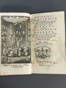 Amsterdam, che Z. Chatelain et fils, 1757. Deux volumes in-12, veau fauve marbré époque, dos à 5 nerfs, pièce de titre maroquin fauve, tomaison frappée sur fond noir, caissons ornés, filet doré aux coupes, tranches rouges (petites fentes aux mors, tom. grattées, des coins frottés, mouillures, brunissures). Ensemble complet des deux volumes, consacrés aux sciences physiques, et qui font suite à l'ouvrage commencé par De Chevigny et continué par H.P. de Limiers. L'illustration se compose de 2 frontispices et de 29 planches gravées sur cuivre. Les tomaisons initiales aux dos étaient de XVI et XVII. Provenance : Daniel Appia (étiq. ex-libris XXe s.).