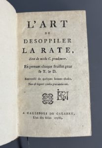 [PANCKOUCKE (C.-J.)]. L'Art de desoppiler la rate, sive De modo c. prudenter. En prenant chaque feuillet pour se T. le D. Entremêmé de quelques bonnes choses. A Gallipoli de Calabre, l'an des folies 175884 [i.e. 1754]. In-12, 480 p., veau havane...
