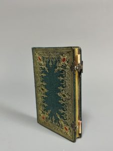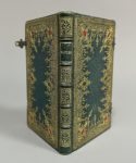 [Papeterie. XIXe siècle]. Petit carnet de notes vierge du XIXe siècle, contenant des papiers variés, fins, en couleurs et avec des motifs. In-18 (12,5 x 8 cm.), plein chagrin émeraude époque, dos à 5 nerfs, titre doré, caissons ornés aux...