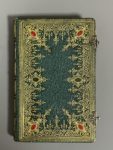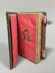 petits fers, riche décor des plats avec dentelle dorée et 6 fleurons mosaïqués, doublures (dont une formant pochette) et gardes de satin rose, tranches dorées, fermoirs (un fermoir en déficit). Intéressant témoignage de la production papetière de l'époque et en particulier de la fabrication de papiers colorés. Provenance : monogramme ACV mosaïqué sur une garde ; petit cachet à sec « AD » répété.