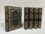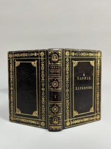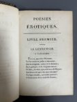 roulette dorée aux coupes et chasses, doublures et gardes de satin moiré vieux-rose, tranches dorées (dos très lég. passés, rouss. et bruniss. modérées). Bel exemplaire relié avec élégance de cette édition soignée, qui s'ouvre sur les Poésies érotiques de Parny. Provenance : mention « À Sophie Lefebvre » dorée sur le premier volume, formant supra-libris ou ex-dono.
