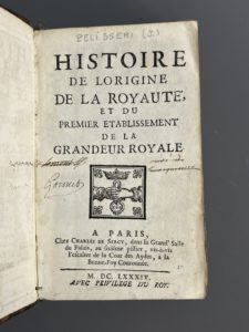 [PELISSERI (Jean de)]. Histoire de l'origine de la royauté et du premier établissement de la grandeur royale. A Paris, chez C. de Sercy, 1684. In-12, veau havane glacé époque, dos à 5 nerfs, pièce de titre maroquin brun, caissons ornés,...