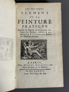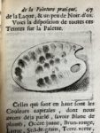 blanc), 96 p., fig., veau havane moucheté XVIIIe s., dos à 5 nerfs, pièce de titre maroquin rouge, caissons ornés, filet doré aux coupes, tranches rouges (coiffe de tête découverte, petit trav. de vers en tête du mors inf., un coin émoussé). Edition originale de cet important traité technique de la peinture, illustrée d'une vignette de titre, de 2 culs-de-lampe et de 7 figures dans le texte, le tout gravé sur cuivre, dont la vue d'un chevalet à pleine page, et les premières représentations gravées de palettes. On trouve, comme souvent, relié à la suite : - Figures d'académie pour apprendre à désiner. Gravées par Sébastien Le Clerc. A Paris, chez N. Langlois, s.d. Suite de 20 planches sur les proportions du corps humain, précédée d'un titre gravé. Et une suite de 30 planches de modèles d'hommes nus, précédée d'un titre gravé allégorique à l'adresse de Jombert et daté de 1751.