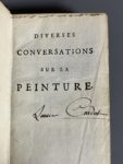 [Relié à la suite, du même :] Dialogue sur le coloris. Paris, Langlois, 1673. Deux ouvrages en un volume in-12, veau brun époque, dos à 5 nerfs, titre doré, caissons ornés, roulette dorée aux coupes, tranches rouges (défauts dont rel. épidermée, dos dédoré ; accrocs et lég. saliss. au 2e ouvrage). Editions originales de ces deux traités. 1. Conversations... [19] f., 309 p., [1] f. (privil.), [13] f. (Termes de peinture), frontispice allégorique gravé sur cuivre. - 2. Dialogue... [2] f. (titre, privil.), 80 p. Provenance : Anatole Cardot (ex-libris manuscrit daté 1758, et typographique daté 1766) ; Louise Cardot (signature).