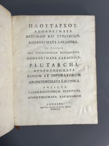 [Typographie grecque]. PLUTARQUE. Plutarchi Apophtegmata regum et imperatorum. Apophtegmata laconica. Antiqua Lacedaemoniorum instituta. Apophtegmata Lacaenarum. Londini, apud G. Darres & C. Dubosc, 1741. Deux parties en un volume in-4, [1] f., 96...