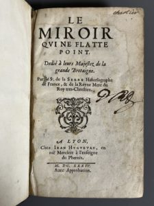PUGET DE LA SERRE (Jean). Le miroir qui ne flatte point. Dedié à Leurs Majestez de la Grande Bretaigne. A Lyon, chez J. Huguetan, 1634. In-8, [16] f., 320 p., pl., veau brun époque, dos à 5 nerfs, titre doré, caissons ornés, tranches jaspées...