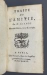 SACY (Louis-Silvestre de). Traité de l'amitié. A Paris, chez Bailly, 1774. In-12, XVI-325 p., [1] f. (approb.), maroquin rouge époque, dos lisse bordé d'un double filet, titre, fleurons, filets, le tout doré, triple filet doré avec fleurettes...
