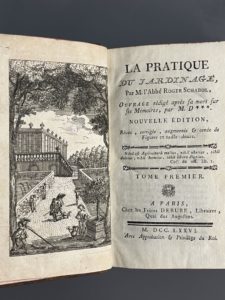 SCHABOL (Jean-Roger) ; [DEZALLIER D'ARGENVILLE (A.-N.)]. La pratique du jardinage, par M. l'abbé Roger Schabol [Texte imprimé]. Ouvrage rédigé après sa mort sur ses Mémoires, par M. D***. A Paris, chez les frères Debure, 1776. Deux volumes...