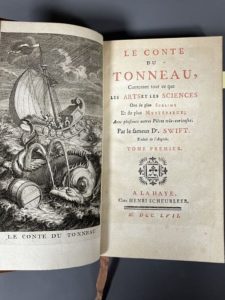 SWIFT Jonathan). Le conte du tonneau, contenant tout ce que les arts et les sciences ont de plus sublime et de plus mystérieux et aussi plusieurs autres pièces très-curieuses... A La Haye, chez H. Scheurleer, 1757. 3 volumes in-12, veau blond...
