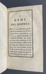 THOMPSON (James). Les saisons, poëme traduit de l'anglois. A Paris, chez Chaubert, Hérissant, 1759. In-12, [1] f. (titre gravé), [4] f. (dédicace à l'Ami des hommes), VIII-332 p., [2] f. (privil.), pl., fig., veau écaille époque, dos lisse et...