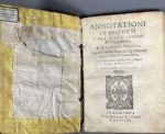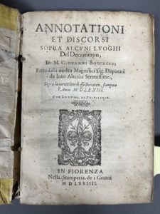[Livre du XVIe s.]. BORGHINI (Vincenzo Maria)]. Annotationi et discorsi sopra alcuni luoghi del Decameron, di G. Boccacci... In Fiorenza, nella stamperia dei Giunti, 1574. In-4, [20] f., 142 p., [9] f. (le dernier blanc), velin souple ancien, dos...