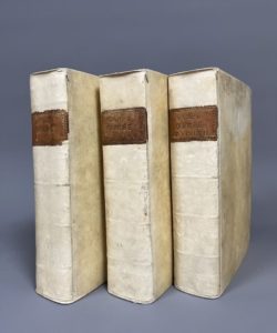 SARPI (Paolo). Opere. In Helmstat, per J. Mulleri, 1761-1763. Huit tomes en 3 forts volumes in-4, parchemin ivoire post., dos lisse, pièces de titre maroquin fauve de réemploi, tranches rouges (accroc sur une coupe, qq. restaurations intérieures...